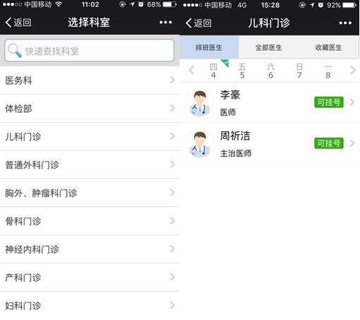 就诊服务>>预约/挂号>>选择科室>>选择日期>>选择挂号的医生>>选择挂号的时间>>预约/挂号信息>>确认>>微信支付挂号