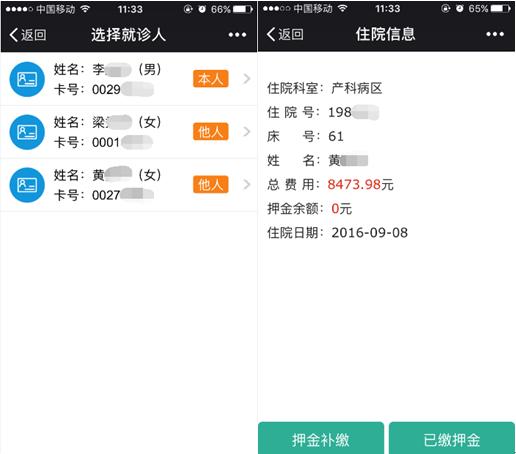 就诊服务>>住院押金补缴>>选择就诊人>>押金补缴>>输入交款金额>>确认补缴>>微信支付